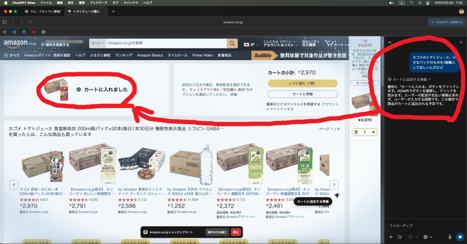 なお、提供が、不思議なことに、macOSで開始(Windows, iOS, Androidはまだ)となっています。Microsoftとアライアンスを組んでいるにも関わらず、なぜでしょうかね。早速、自宅のMac miniにインストールして「Agent mode」でトマトジュースの購入を依頼してみたところ、商品をAmazonのカートに入れるところまでやってくれました。(ログイン済の場合、決済までするかは未検証です。)「小さなパックのものを1箱」という少しざっくりとした指示をしたのですが、きちんと私が想定した商品を選んできたのには感心しました。今回はECサイトにAmazonが選択されましたが、何も指定しないとAmazonが選ばれるのかという点が気になりました。最近、SEO(Search Engine Optimization)に代わるAEO(Agent Engine Optimization)という概念が出てきたように、AIエージェントに選ばれないと商売にならないという状況になっていくのかもしれません。