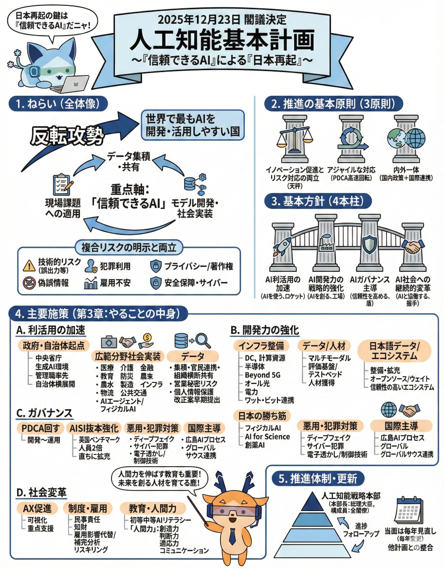 日本政府は12月23日の閣議で、AIの開発や活用に関する初の方針となる「AI基本計画」を決定しました。中身についてはAI(Gemini)の力を使って、グラレコ(グラフィックレコーディング)風の画像にしてみましたのでぜひ読んでみて下さい。