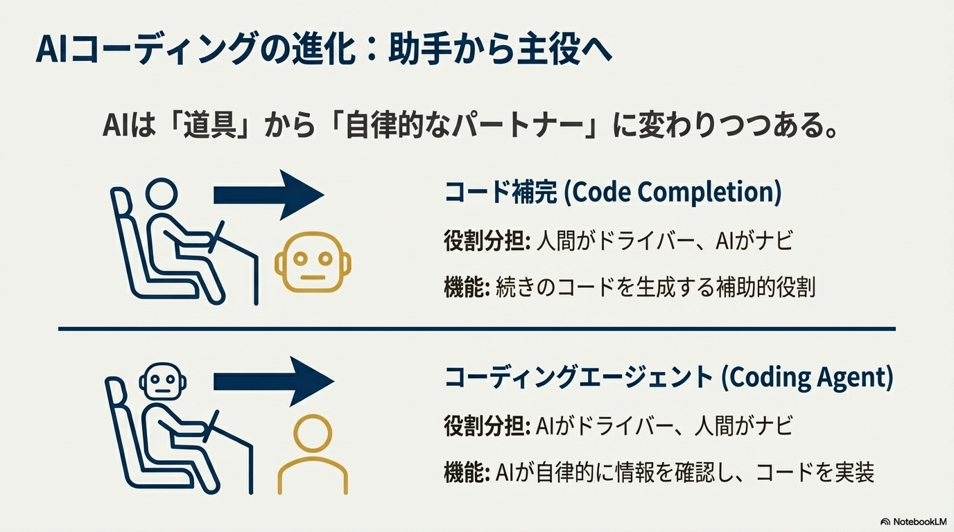 これまでシステム開発におけるAI活用といえば、プログラマーがコードを書くのをAIが横から手助けする「ナビゲーター」のような関係が主流でした。しかし、今回NTTデータが目指すのは、AIが「ドライバー」となり、人間はその監督に回るという完全な主従逆転です。