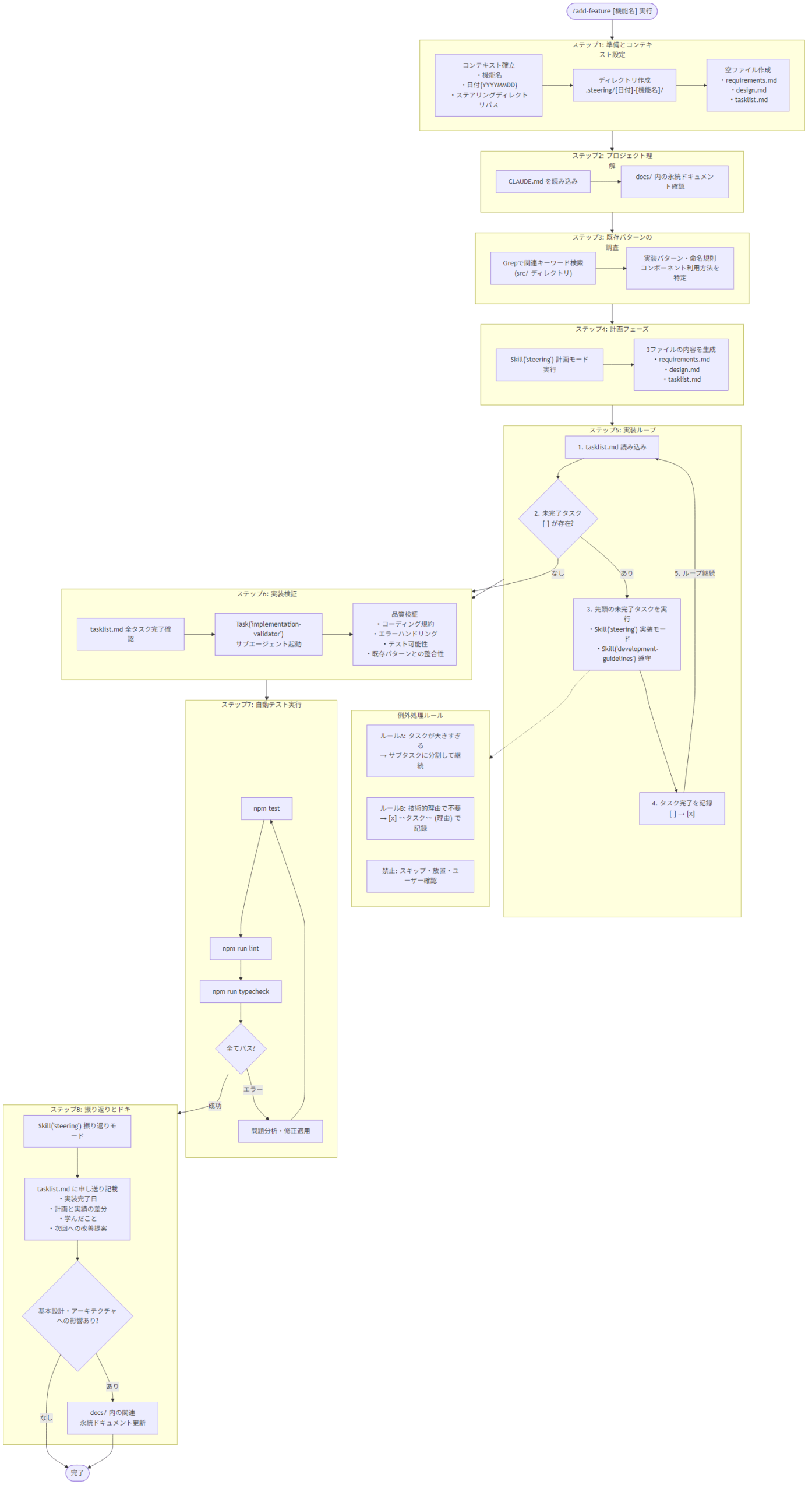 つまり基本的に人間は、初回に/setup-projectでドキュメント作成をおこない、2回目以降は/add-featureによってタスクを段階的に渡すだけで実装作業がおこなえます。ただし、その後に出来上がってきた成果物のレビューは人間がおこなう必要があります。(出荷責任は人間にありますから当然ですね。)