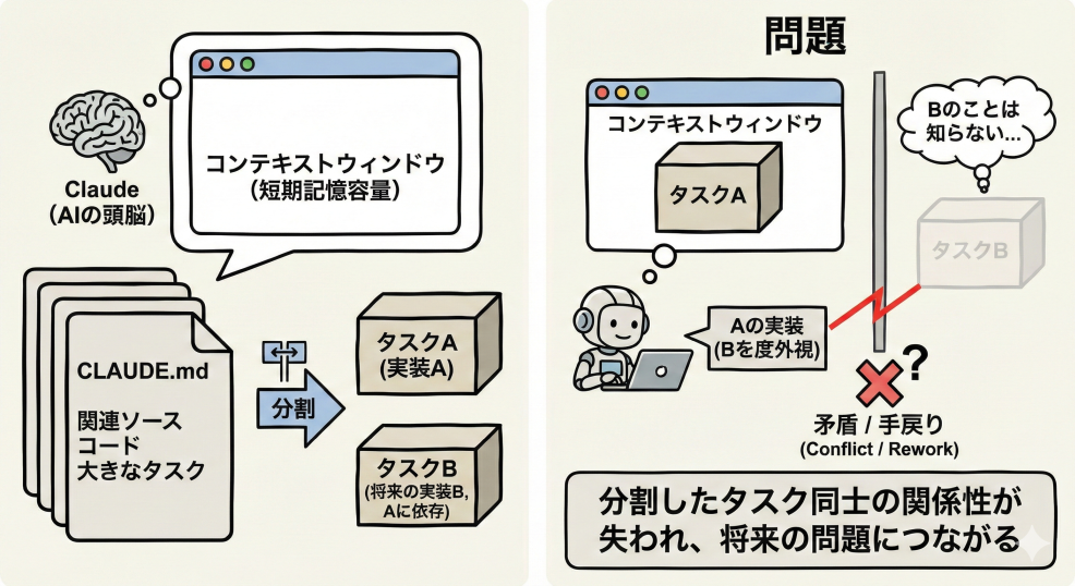 Claude Codeの頭脳に当たるClaudeでは、コンテキストウィンドウと呼ばれる短期記憶容量が決まっています。(これはClaudeに限った話ではなく、GPTもGeminiも同様です。)そのため、新しいセッション開始時には改めてCLAUDE.md等の文書や関連するソースコードを読みこませてタスクの内容を把握させる必要があります。また、大きなタスクの場合には、コンテキストウィンドウに載るように小さな複数のタスクに分割する必要があります。しかし、この分割したタスク同士が関係を持っている場合に、問題が起こる可能性があります。例えば、Aの実装をする際に、後からBの実装を追加できるようにAを実装しなければならない場面で、Aのことしか短期記憶に載っていないと当然Bのことは度外視した実装になってしまいます。