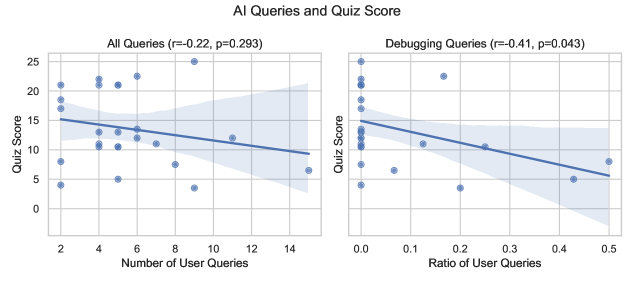 以下は、AIへのクエリー回数と理解度確認テストのスコア(左)、デバッグに関するクエリの割合と理解度確認テストのスコア(右)の散布図です。なお、両方の図にあるr値は相関係数(2変数間の直線的な関係の強さと向き(-1〜1))を表します。p値は前述のとおりです。この二つを組み合わせて両図を読み解くと、クエリー回数と理解度確認テストのスコアは負の相関があるが有意差(p ≧ 0.05)なし、デバッグに関するクエリの割合と理解度確認テストスコアは負の相関があって有意差あり(p < 0.05)ということになります。