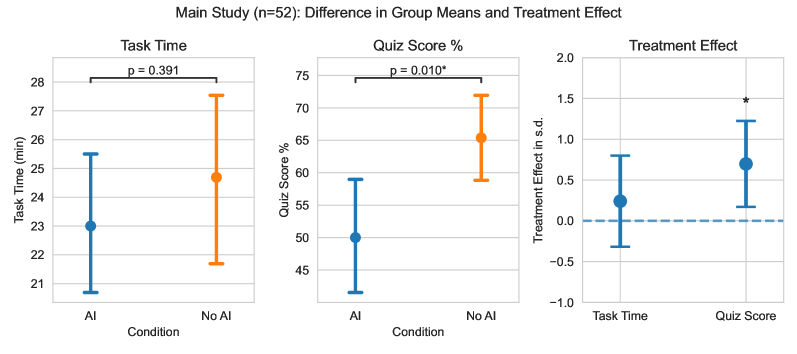以下は、AI支援あり と AI支援なし のグループそれぞれが、課題に実施の所要時間(左)、理解度確認テストのスコア(中央)、AI支援の有無による影響度を表す標準偏差(右)のエラーバー付きプロット(エラーバーは95%信頼区間、プロットは平均値)です。