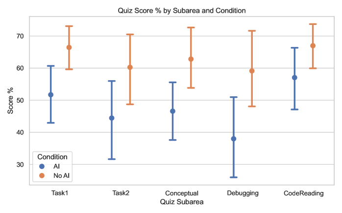 以下は、理解度確認テストの出題区分(タスク(課題の一つ目または二つ目)および問題タイプ(概念、デバッグ、またはコードリーディング))ごとのスコア獲得率のエラーバー付きプロット(エラーバーは95%信頼区間、プロットは平均値)です。注目すべきはデバッグに関する問題において、AI支援あり と AI支援なし の平均スコアの差が最も大きかった点です。