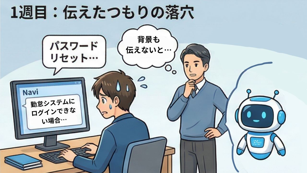 「勤怠システムが最近リプレイスされたこと、旧URLからのアクセスが問い合わせの主な原因であること、新URLの情報。これらを伝えないと、ナビは一般論しか返せない。逆に言えば、正しいコンテキストを渡せば、正しく動ける。」