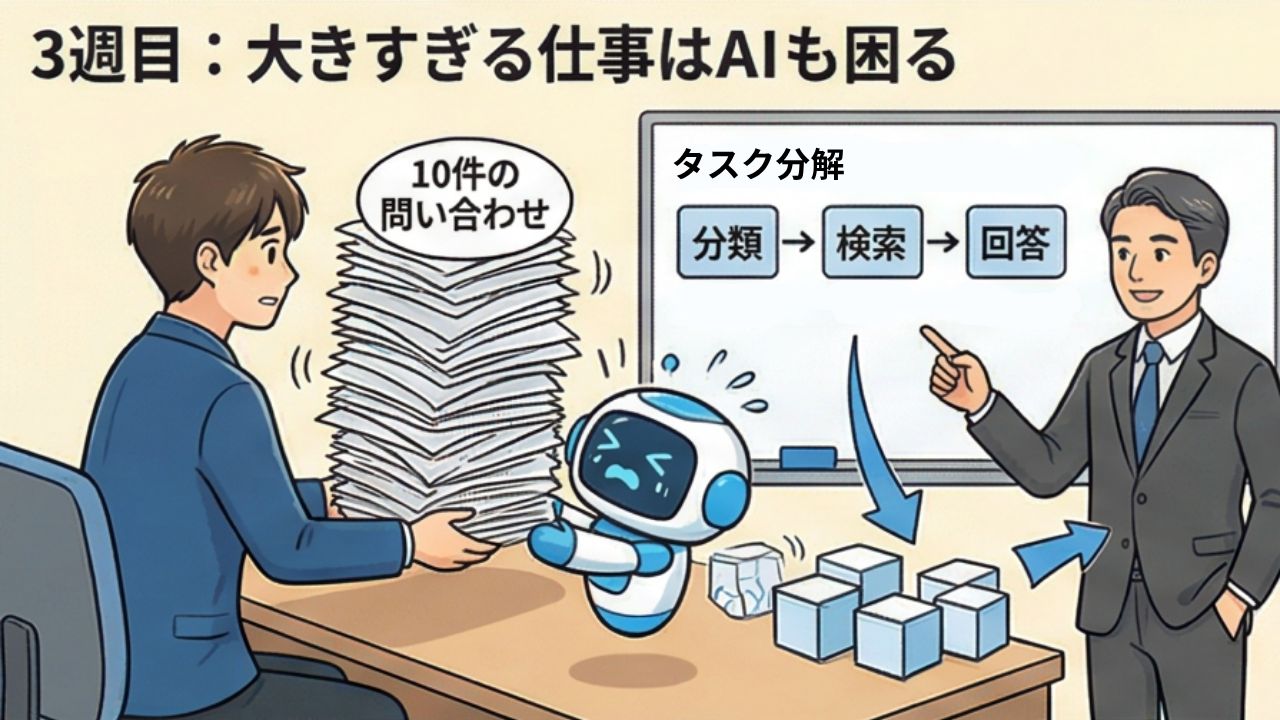 この週の気づき:AIに仕事を任せるとき、「何を渡すか」だけでなく「どの粒度で渡すか」も重要。大きなタスクは、AIが確実に処理できるサイズに分解する。