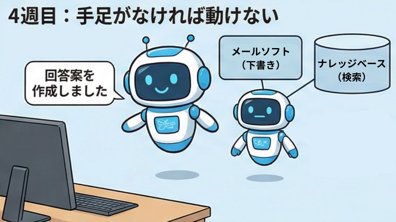 「それは ツール連携 の話だね。AIが自律的に動くためには、外部のシステムやサービスと接続する『手足』を与えてやる必要がある。ナレッジベースの検索APIに接続すれば自分で記事を探せるし、メール送信のAPIに接続すれば自分で送ることもできる。」