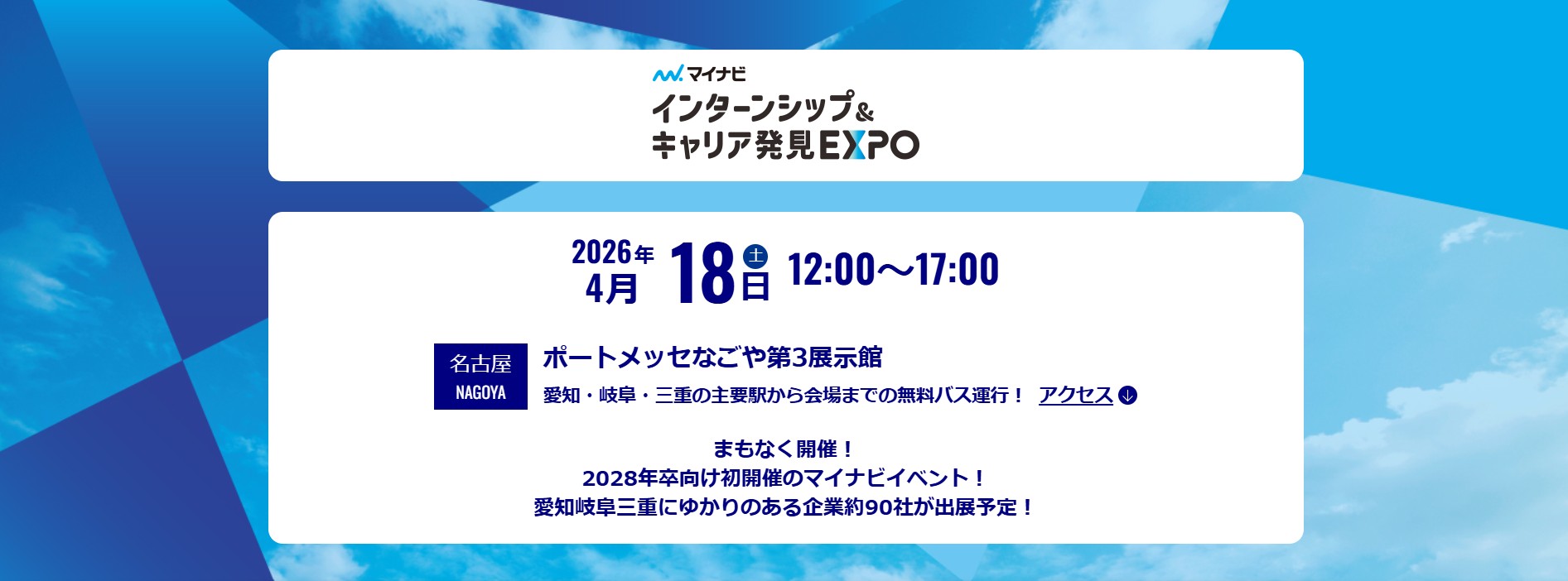 4/18(土)に《ポートメッセなごや》で開催される株式会社マイナビ主催「インターンシップ&キャリア発見EXPO」に参加いたします。