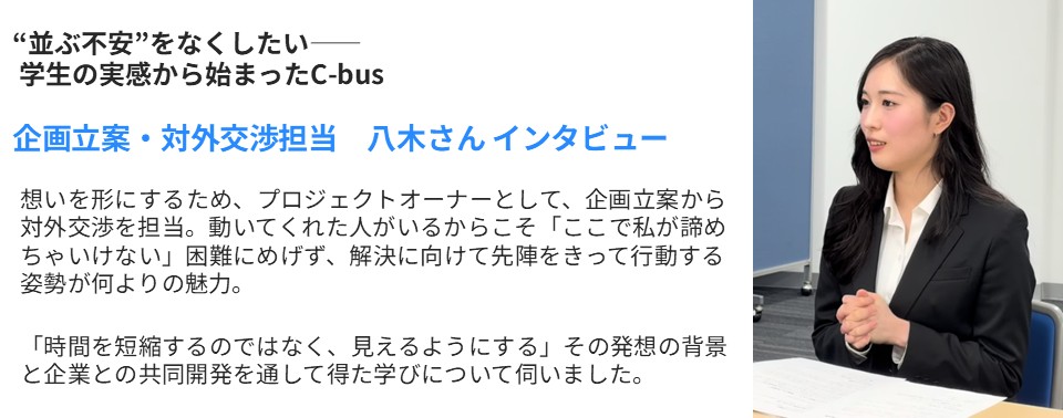 自分も大学に入って最初の2年間はバス通学でした。「あと何分待つんだろう」と毎日のように思っていたので、その不安を解消できるアプリになれば嬉しいです。特に雨の日に使ってほしいですね。バスに乗る前に、「とりあえずC-busを見る」そんなふうに、学生の日常の一部として使われる存在になってほしいです。